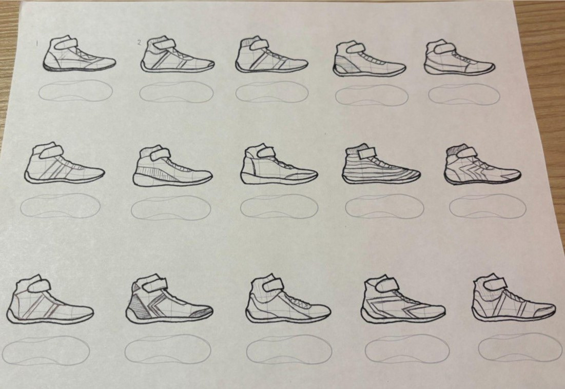 I began with a basic Sparco footwear shape and made overlays to sketch diffrent designs on the shapes. With a few selected designs chosen, I began to alter the shape to fit the comfortability part of my design guidelines. Eventually landing on the design that I feel best represents my guidelines and the Sparco brand.
